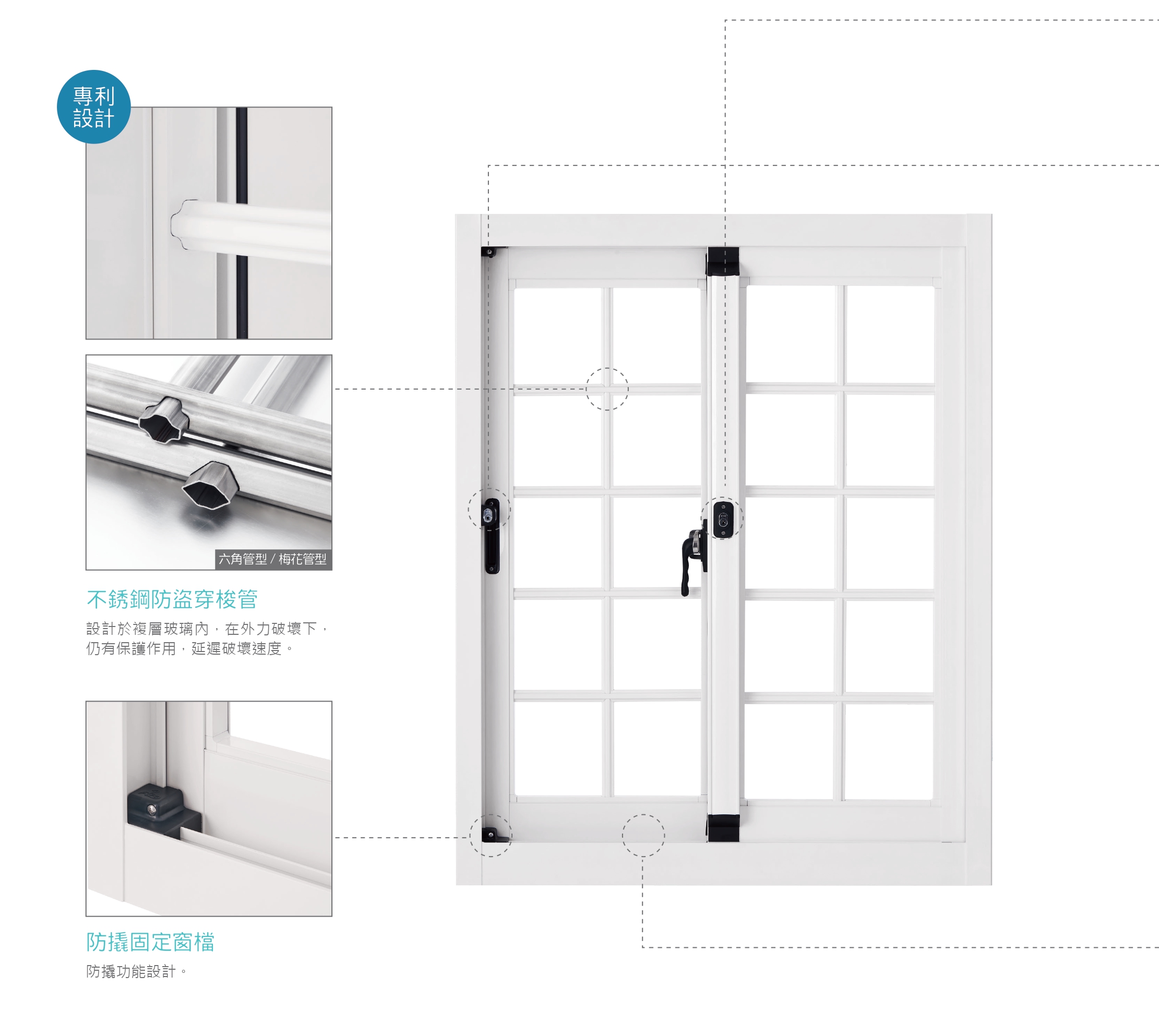 突破傳統鐵窗缺點,保留所需的堅固,層層保護同時不阻礙逃生動線,堅固不銹鋼防盜穿梭管夾於複層玻璃,享有窗戶美觀又輕鬆保養,專研防盜工法,讓你的窗戶不再只是窗戶。